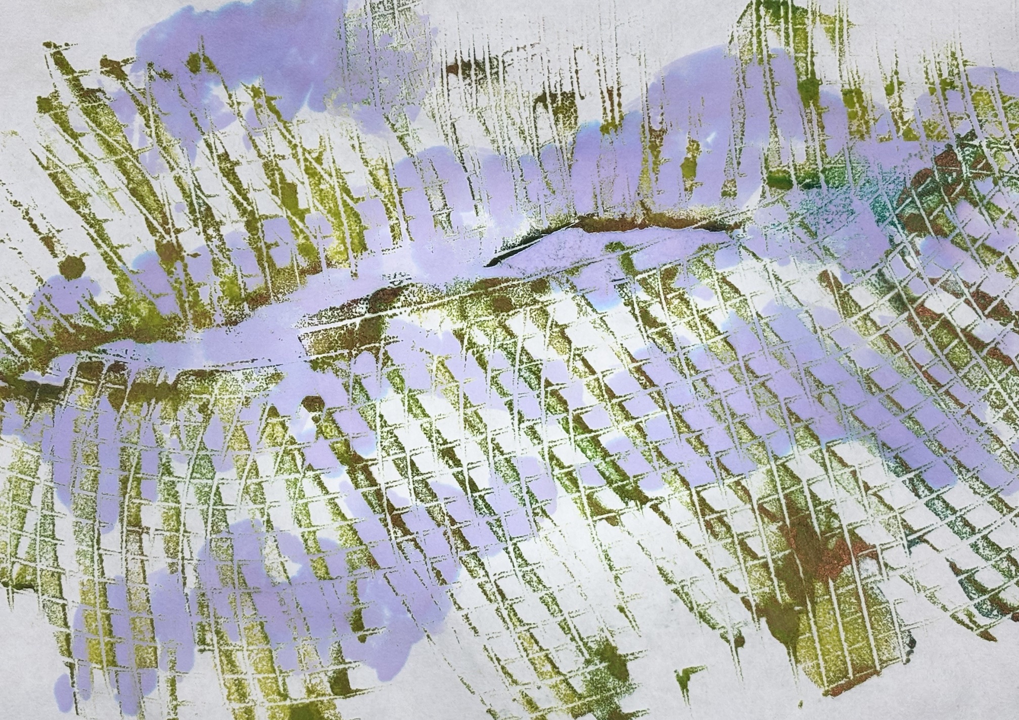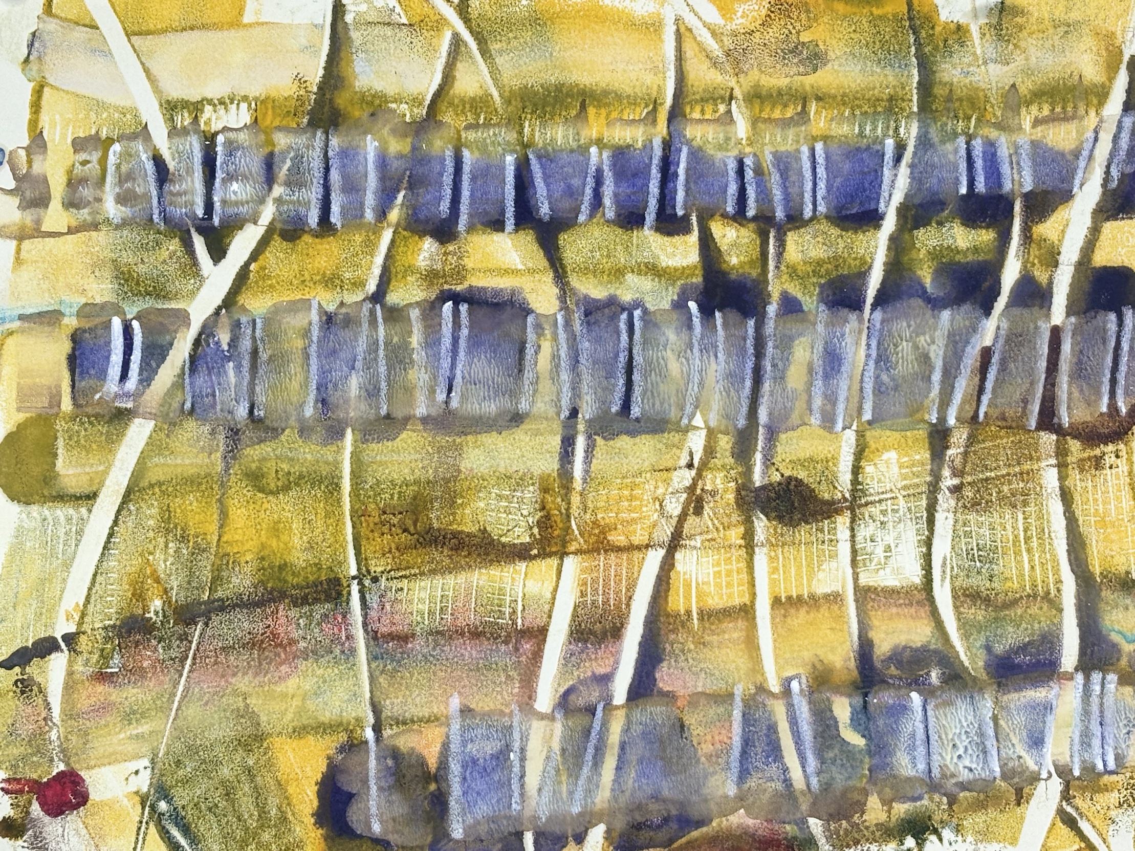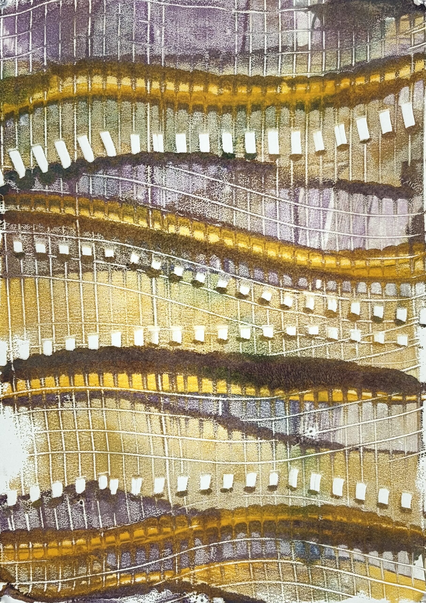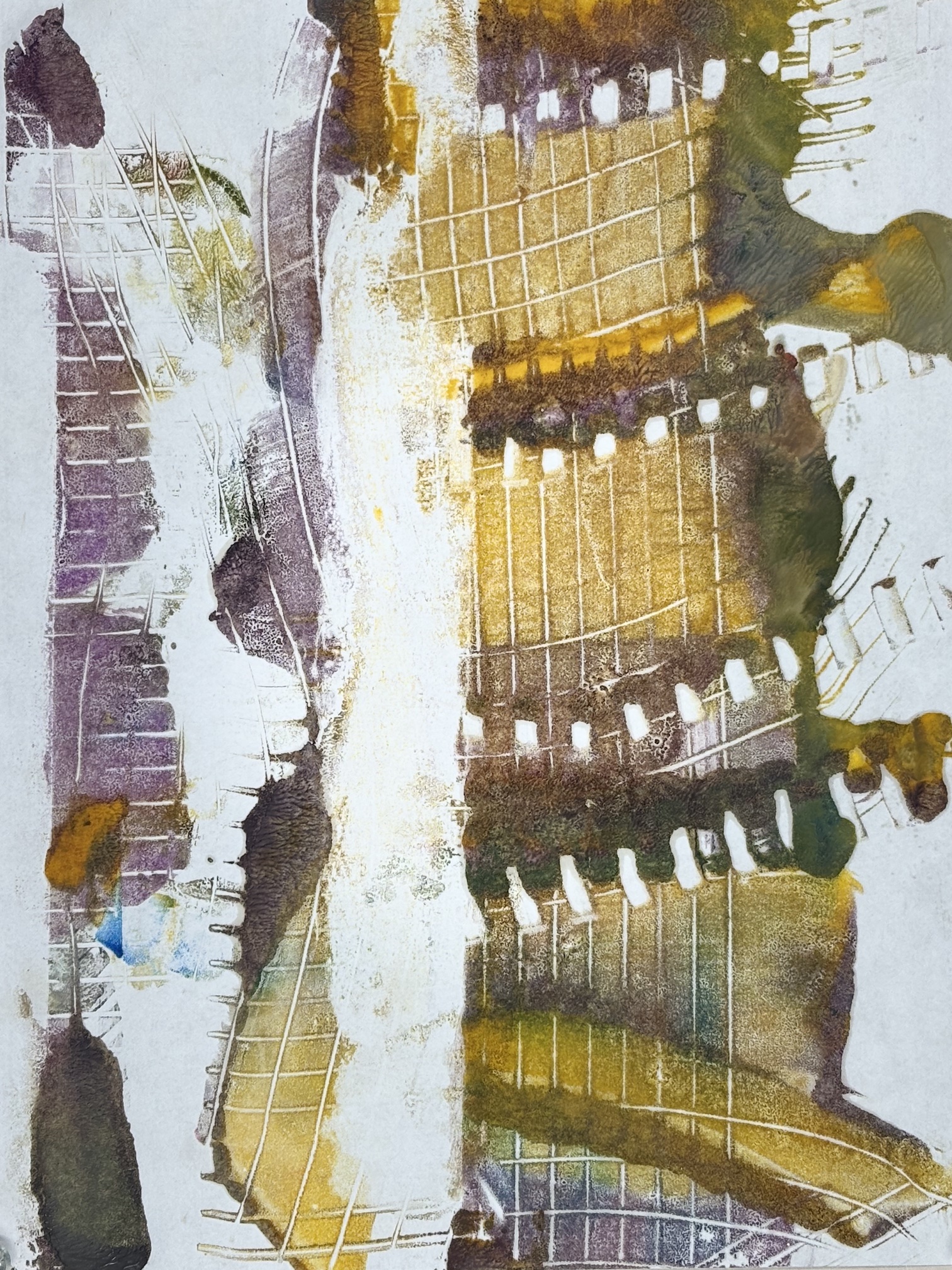Encaustic monotype is a one-of-a-kind printmaking process in which I paint with pigmented beeswax on a heated metal plate, or hotbox. The warm surface keeps the wax fluid, allowing me to create expressive marks, blend colors, and build subtle layers of texture.
