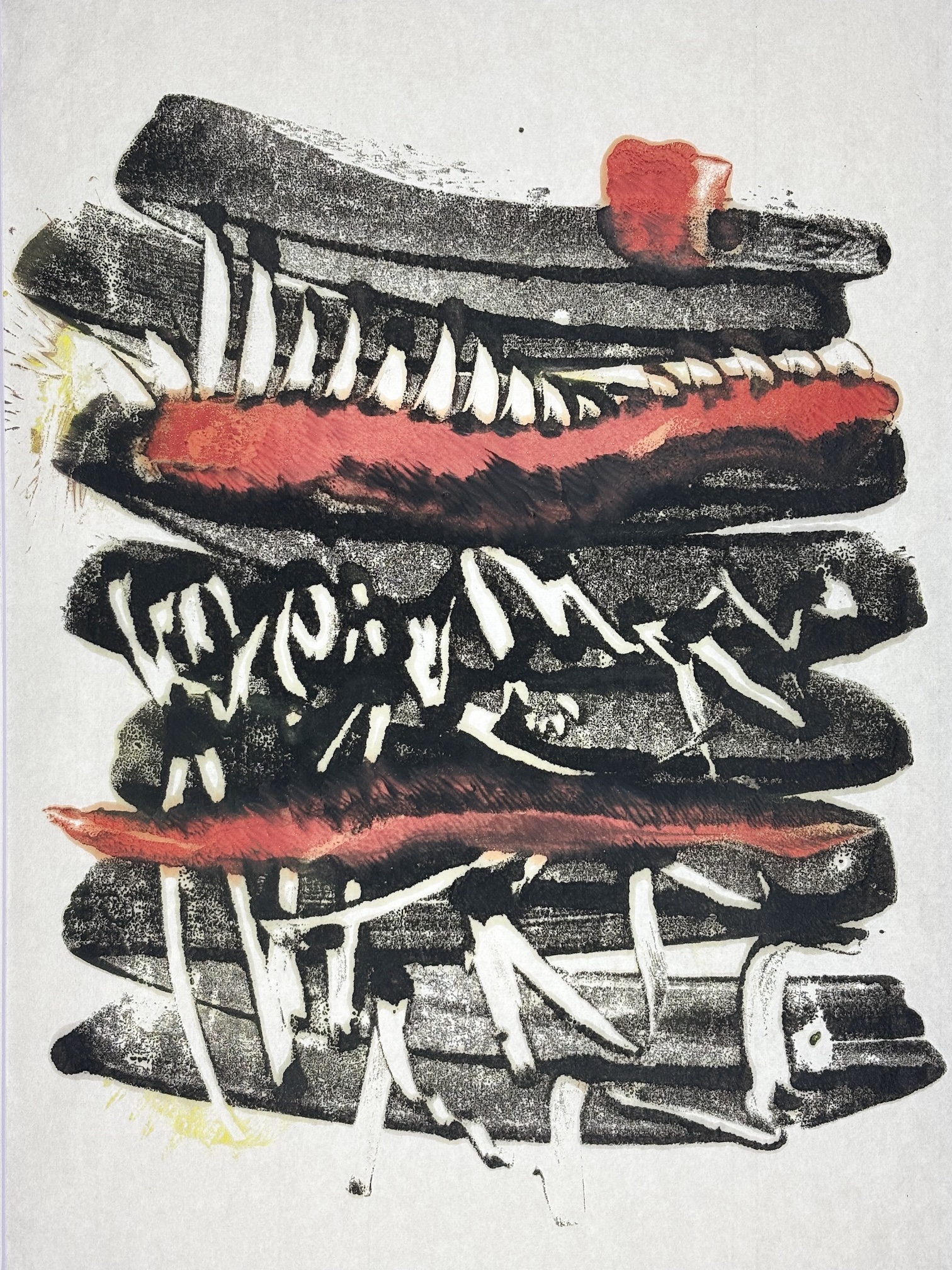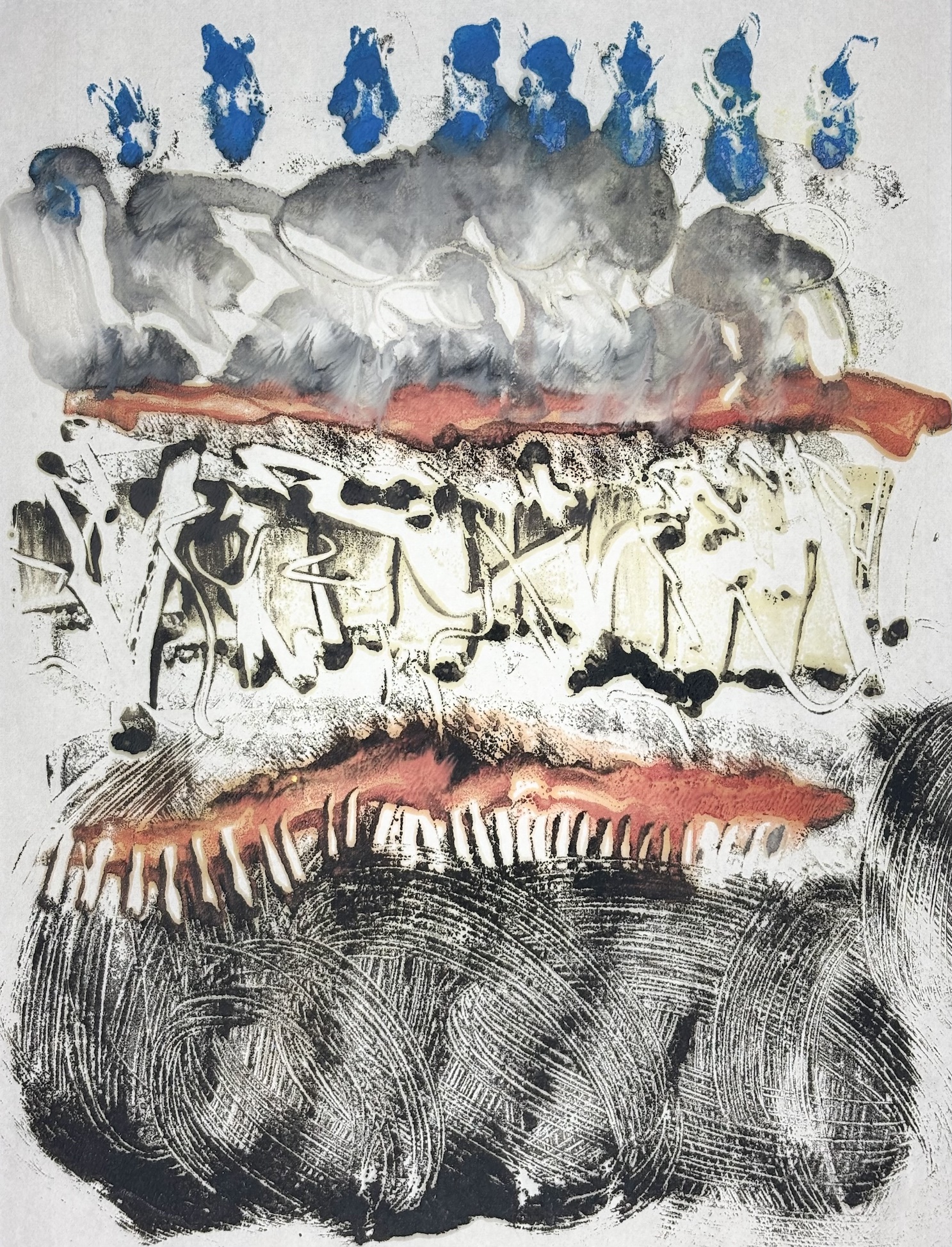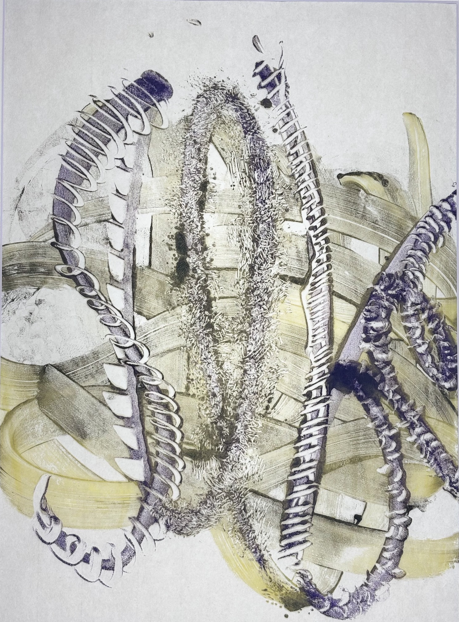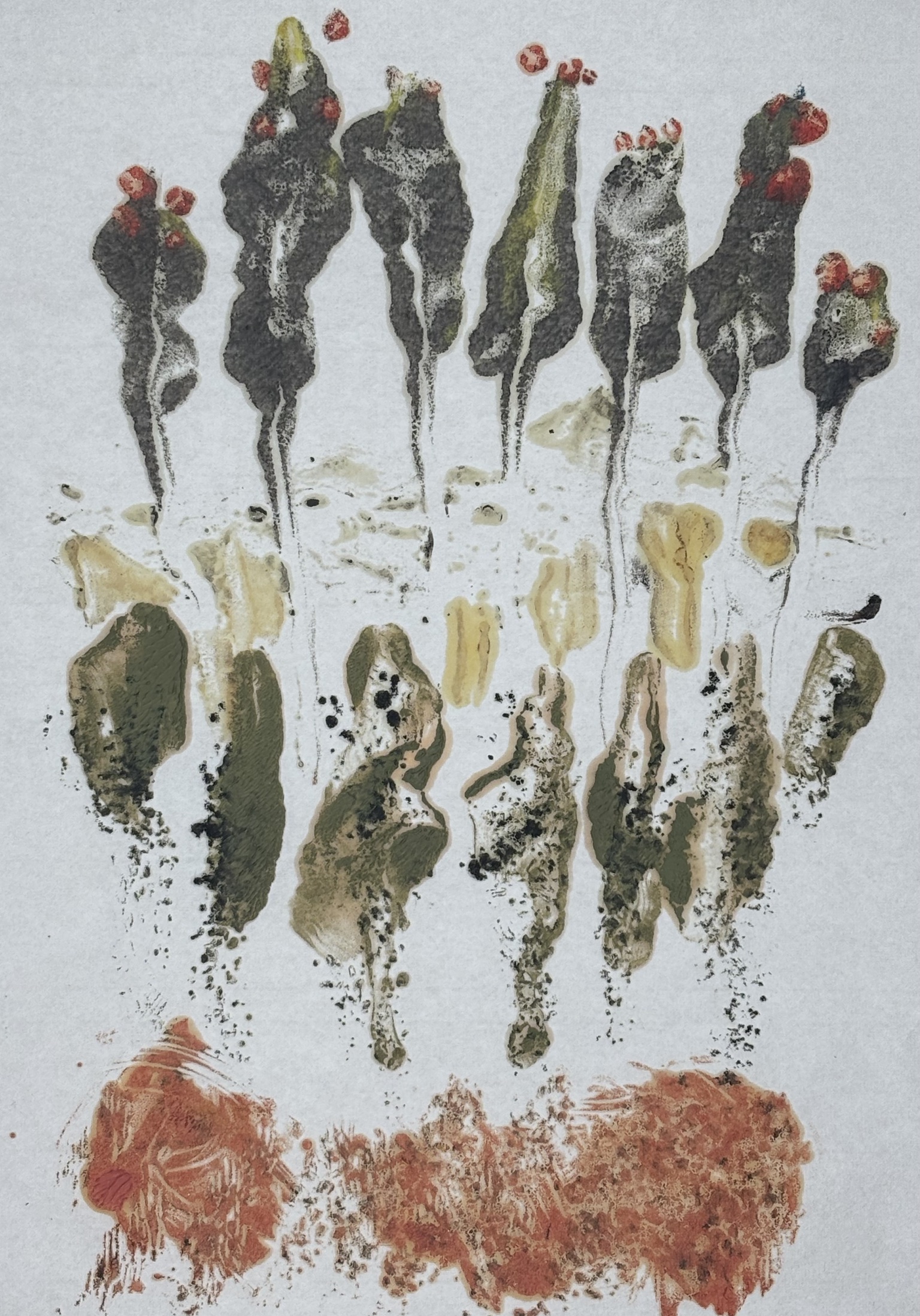 Encaustic monotype is a one-of-a-kind printmaking process in which I paint with pigmented beeswax on a heated metal plate, or hotbox. The warm surface keeps the wax fluid, allowing me to create expressive marks, blend colors, and build subtle layers of texture.
